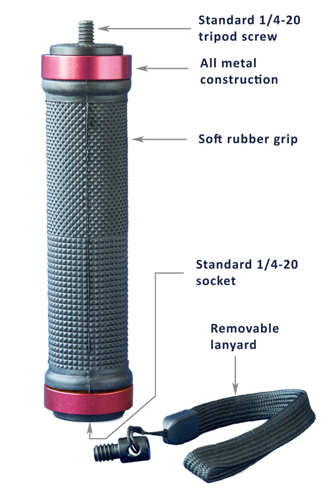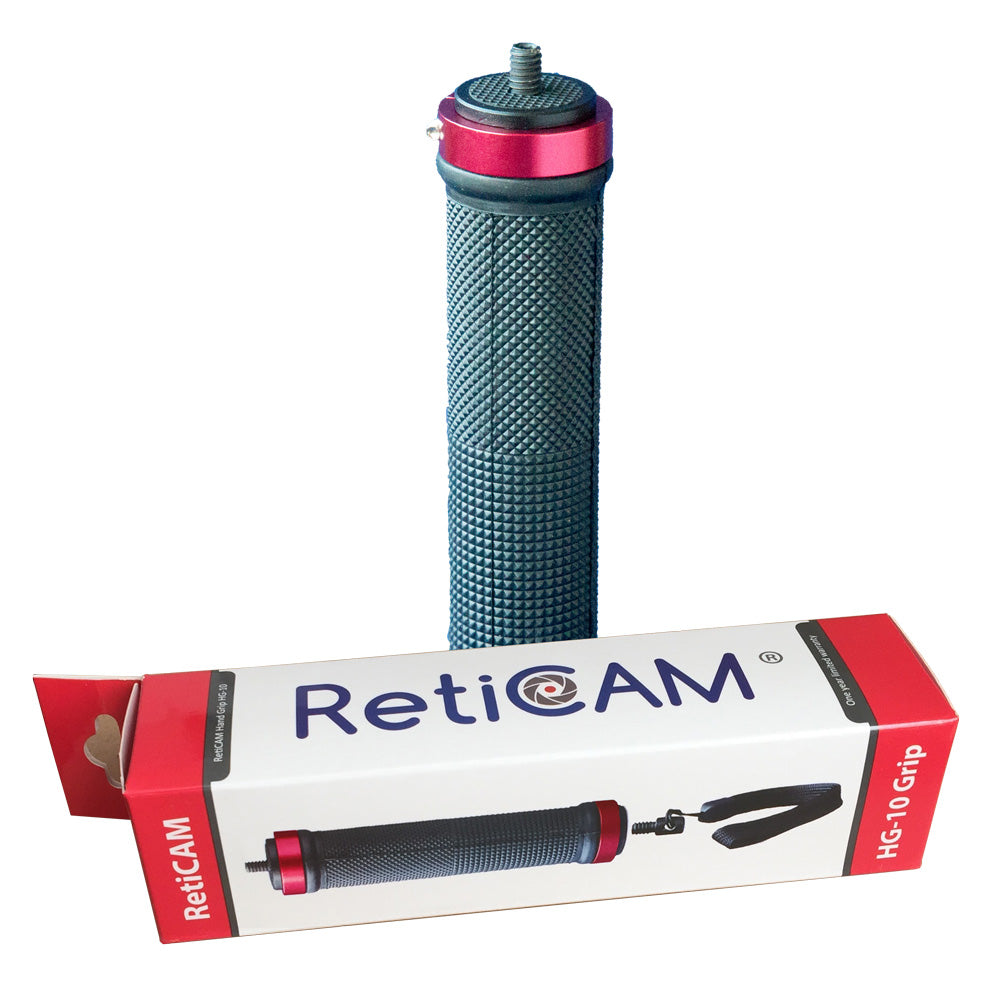 Another perfect use case for this grip is for an action camera or a smartphone. It is much easier and more secure to hold your GoPro or cell phone with this grip than hand held, especially if you're moving. A tripod adapter is required (not included in this listing). Our HG20 model comes with a GoPro tripod adapter, and HG30 is bundled with our highly-rated smartphone tripod mount. The RetiCAM HG10 Grip has a standard 1/4-20 male tripod screw on top, and a 1/4-20 socket on the other end. A lanyard with screw attachment is included.